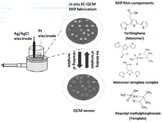 The recognition of chemical nerve agents has also been successfully achieved by using MIP-based QCM sensors. In 2012 Vergara et al. [59] developed an electrochemically MIP polythiophene film QCM surface for selective and sensitive detection of pinacolyl methylphosphonate (PMP). The lectrochemistry-QCM (EC-QCM) technique was used for the deposition of the MIP film onto the electrode. Figure 9 shows the schematic depiction of the MIP-based QCM sensor toward PMP. The synthesis was performed using cyclic voltammetry (CV) techniques applying apotential in the range of 0 to 1100 mV.