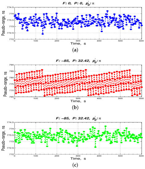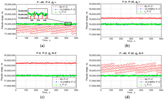 Figure 11a. We simultaneously extended the cable by 8 m (32.42 ns) to the 1 PPS and the 10.23 MHz of the ISL prototype and decreased the 10.23 MHz by 85 mHz. The pseudo-range measurement results with and without the phase compensation sensor are shown in
