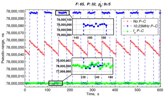 Figure 9, when the 1 PPS is in the skip area, the measurement pseudo-range has an approximately 97.75 ns periodic jump with a phase compensation by directly tracking the 10.23 MHz. Nonetheless, after the proposed phase compensation sensor, the inter-satellite measurement results are maintained at approximately 78 ms.