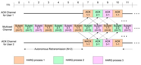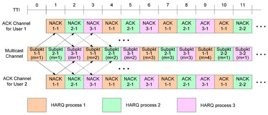 3GPP LTE and IEEE 802.16m adopted the multi-process stop-and-wait HARQ mechanism, which interlaces several independent stop-and-wait HARQ operations in time so as to fully utilize transmission resources [13,14,15]. Figure 1 describes the conventional HARQ scheme, where multicast packets are transmitted to two users by interlacing three HARQ processes, and the decoding delay is one transmit time interval (TTI) in both the uplink and downlink transmission. In this case, the transmitter repeatedly sends a packet until ACK messages are received from all the multicast users or until the limit for the number of retransmissions is reached. For example, in Figure 1, the transmitter starts to send a new packet when TTI = 10 after receiving ACK messages from both users when TTI = 9 (ACK messages for Subpkt 2-1 were transmitted when TTI = 8). Since the conventional HARQ method for multicast is a direct extension of the conventional HARQ scheme for unicast, it can be easily implemented in practical communication systems. However, the overhead from ACK/NACK feedback rapidly increases as the number of multicast users increases.