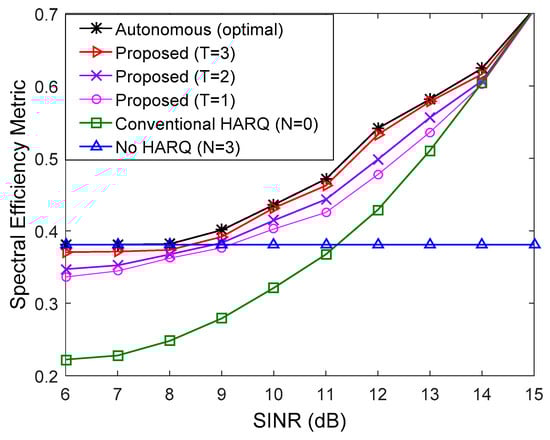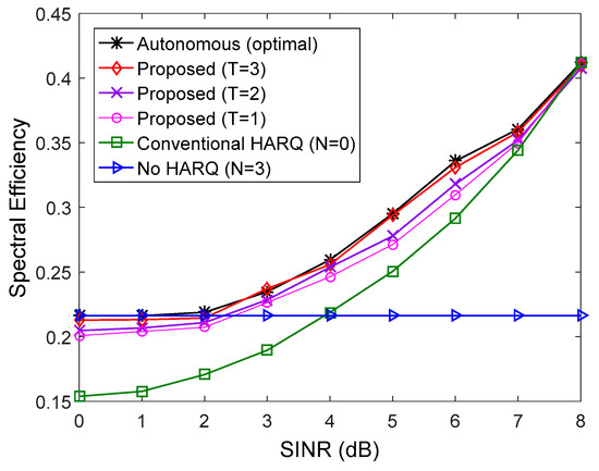 In Figure 3 and Figure 4, the spectral efficiency of the proposed method is compared to that of the conventional method when the number of multicast users is 10 () and all users have the same downlink average SINR. We used QPSK and 16 quadrature amplitude modulation (16QAM) in Figure 3 and Figure 4, respectively. For comparison, the spectral efficiency of transmission without the HARQ scheme () was also presented. In the low SINR regime, the number of autonomous retransmissions for the proposed HARQ method is increased to reduce feedback overhead resulting from high PER. Thus, the proposed method performs better than the conventional HARQ scheme. Since the number of autonomous retransmissions for the proposed method is decreased to avoid unnecessary autonomous retransmission in the high SINR regime, the proposed scheme achieves higher HARQ gain than the non-HARQ approach. The performance of the proposed scheme improves with increase in the update interval, . When , the proposed method performs very similarly to the autonomous method with the optimal determined by (17), which is the theoretical upper limit. If the exact value of PER for all users in the multicast group is known at the transmitter, the optimal can be determined by (17), but it is not possible in real situations due to the continuous change of channel conditions of multiple users. Therefore, the number of autonomous retransmissions, is calculated using the procedure in Section 5. Figure 5 shows an example of adaptation of with the different value of in the simulation environment of Figure 4 at SINR = 11 dB. The optimal calculated from (17) is two, and when , the difference between the estimated and the optimal is minimized.