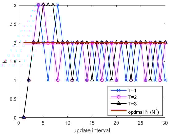 An example of adaptation of N for different value of T in the simulation environments of Figure 4 at SINR = 11 dB.