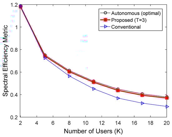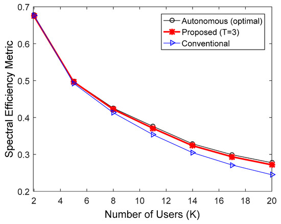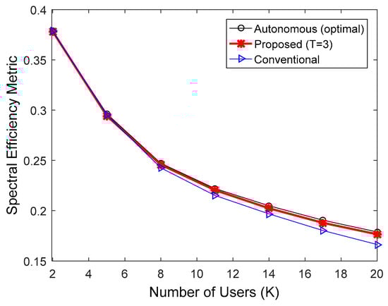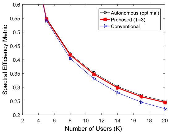 By substituting (14) and (15) in (3), the spectral efficiency metric for the proposed algorithm, , is expressed as