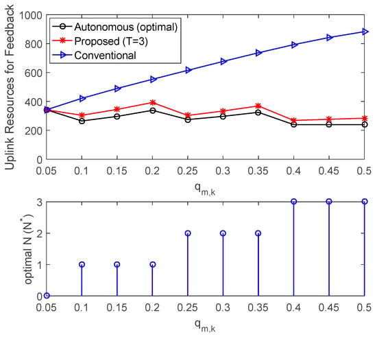 Comparison of required uplink resources for ACK/NACK feedback and optimal N according to different value of qm,k when K = 10.
