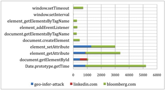 To illustrate the problem, we monitored a set of important JavaScript APIs that are responsible for handling HTML elements and processing browser environment information. We measure the frequency the functions are called in web applications, which include websites with probing behaviors and Alexa Top 5000 websites. The selected experiment results shown in Figure 1 demonstrate that probing websites inevitably invoked some APIs to accumulate privacy information. For example, during the period of our measurement, Date.getTime() is invoked 860 times by a site preforming geo-location inference [18]; element_getAttribute() is called 860 times; and element_setAttribute() is called 1290 times. However, we also found benign websites calling such APIs in a relative high frequency. For example, bloomberg.com called Data.prototype.getTime() 4341 times, element_getAttribute() 2483 times, and element_setAttribute() 1709 times, respectively.