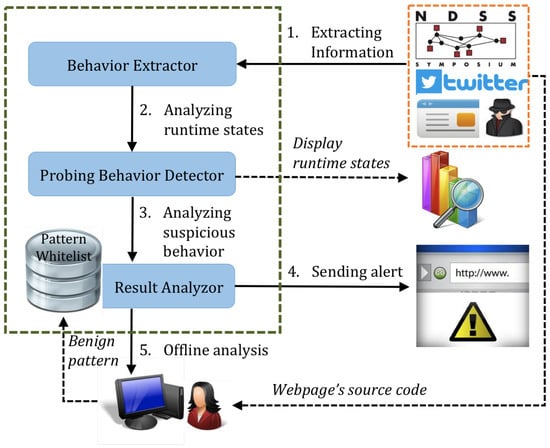 In particular, the Behavior Extractor component monitors the web application and extracts its runtime execution information; the Probing Behavior Detector analyzes the runtime states gathered by the Behavior Extractor and detects suspicious timing-based probing behaviors; according to the knowledge in Pattern White List, Result Analyzer analyzes the suspicious behaviors detected by Probing Behavior Detector; once a malicious behavior is confirmed, it displays an alert to the browser user. The intercepted behaviors and detection results are made available to the Offline Analysis component, where analysts identifies benign repetitive timing behaviors and update the Pattern White List, so that such benign behaviors will not be flagged as attacks in the future.