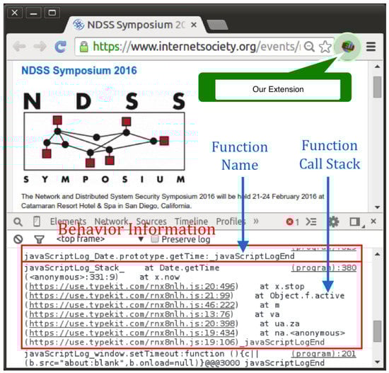 We have prototyped our approach as an extension to the Google Chrome browser. Our prototype is based on the 64-bit Chrome browser (Version 42.0.2311.90). Figure 3 shows a runtime snapshot of the implementation. In Figure 3, our extension is displayed at the right side of the address bar. The website behavior information is logged into browser console, which includes critical function names and function call stacks. In this section, we describe the challenges we addressed in the implementation and introduce our system in detail.
