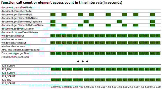 To avoid disturbing the user, we cannot directly draw the chart on top of the web page. Instead, we draw the chart in the pocket-size web page managed by the extension. Before drawing the chart, we need to send the counters values from content_scripts to this pocket-size web page, which can be done by using the extension’s built-in communication method onRequest and onMessage. Additionally, for the drawing part, we choose to use a simple, but practical way, which is to create a <table> element and modify the elements’ value and their background colors. We get counter values as a group every few seconds and calculate the difference between values of two adjacent groups. Then, we write the calculated results to the elements of the right-most column of the table. We also set background colors of elements whose value is not zero, to address newly-appearing function calls or element accesses. In this way, our charts show function calls and element accesses in the past few seconds, as well as the history data used to compare with the latest ones. Figure 4 visually illustrates the real-time states of the testing website, which includes the number of functions calls and HTML element accesses in specific intervals (in this example, we counted in 0.5 s). The difference of the counter values in a time interval is shown in the green block, and the corresponding time interval is listed on the bottom of the chart. The blank part represents that the counter value difference is zero in the current time interval.