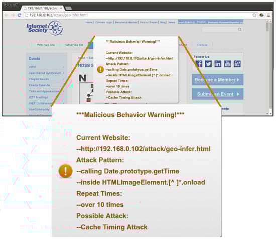 Given a web application, we calculate the times of successful pattern matching at runtime and a pop-up warning message once the counter value exceeds a certain threshold. Figure 5 displays how it works when the detector finds suspicious behaviors. The warning information shown in the system alert includes the URL of the suspicious website, attack pattern matched, repeat times, possible attack, etc.