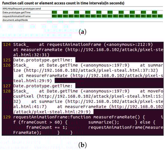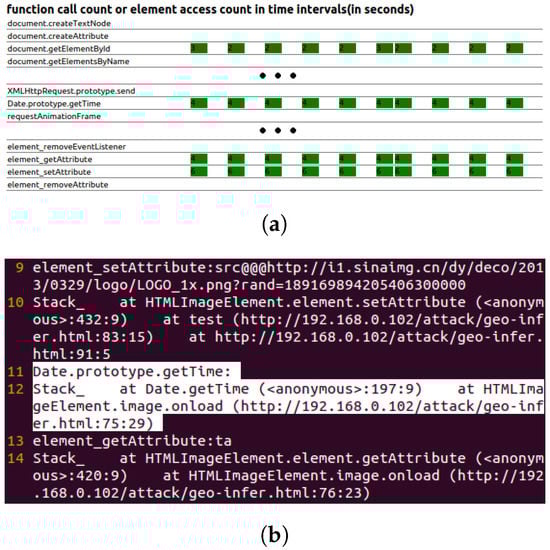 Web caching-based timing probing attack. (a) Real-time function call and element access chart; (b) behavior log (attack pattern is highlighted).