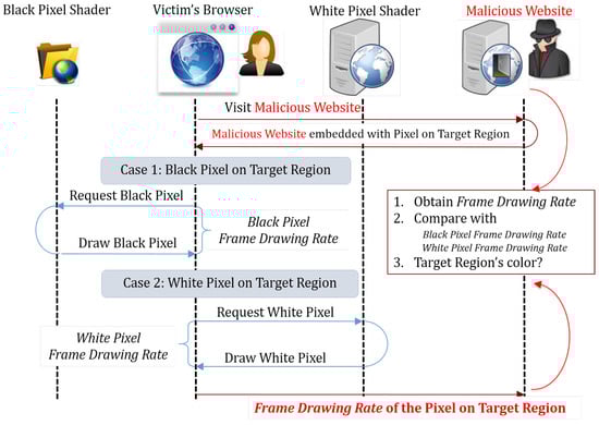 The shader inside browsers often takes different times to draw pixels of different colors. In theory, by measuring the time took to draw a pixel, the attacker can know the color of this pixel. Additionally, by traversing all pixels inside a target region of the target website, the attacker can get an image of this region, i.e., “see” this region of the target website.