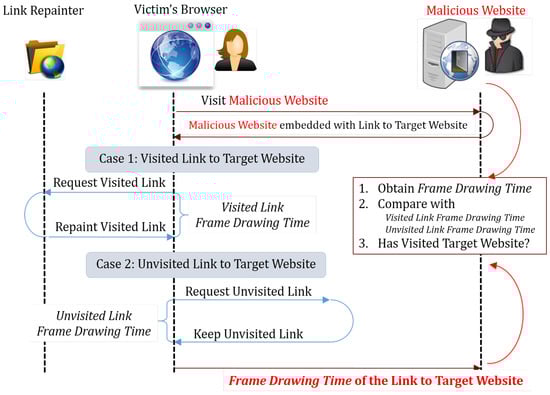Kotcher et al. [14] discovered two timing probing attacks using CSS default filters. The first attack can check whether a user has an account with a website by exploiting the Document Object Model (DOM) rendering time difference. Additionally, the second attack can sniff user browsing history or read text tokens by stealing pixels on the user’s screen. They conducted evaluations of their attacks and proved the attacks’ feasibility.