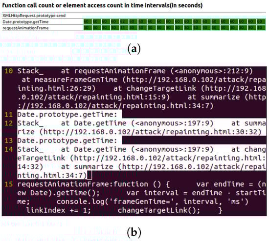 Repainting based timing probing attack. (a) Real-time function call and element access chart; (b) behavior log (attack pattern is highlighted).