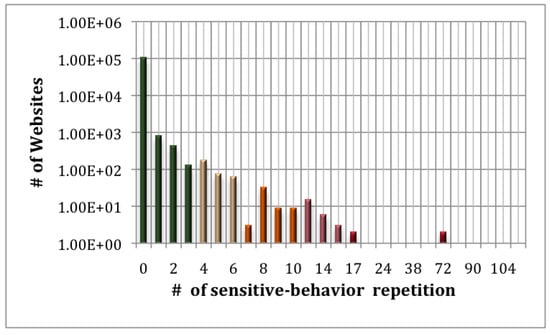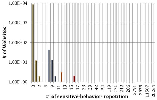 We also conduct the experiment on 10,000 randomly selected websites among the Alexa Top 1,000,000 websites (8695 valid results) to test the pixel-based probing behavior and summarize the result in Figure 13. As shown in Figure 13, only 36 websites have the pixel-based probing pattern over 10 times. According to the testing result, we suggest to use the experiential value, 10, as the detecting threshold, and the experiments also demonstrate that our approach will not affect most of the normal websites.