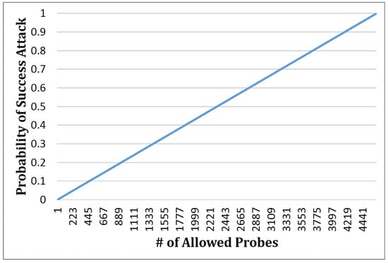 In the practical attack discussed by Jia et al. [18], the amount of map tiles of New York City is 4646, that is . The probability of a successful attack with n times probing is shown in Figure 14. According to the Figure 14, if the detecting threshold is set as 10, the success rate will drop from 100% to 0.13%, compared to unlimited probing times.
