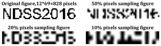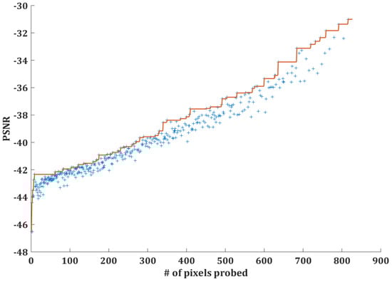 We select a sample image, shown in Figure 15, as the original image the attacker wants to probe, sample it in every possible sample point distribution; use the interpolation method to recover the original image; and use PSNR value as the metric of the recovery effect. Figure 15 shows the example image and the recovered image based on different numbers of uniformly-distributed pixels. The blue crosses in Figure 16 show the PSNR value of the recovery based on different numbers of pixels, and the red step curve shows that the best PSNR value can be achieved based on different numbers of pixels. From this figure, we can see that limiting the number of pixels that the attacker can probe will influence the image recovery effect significantly.