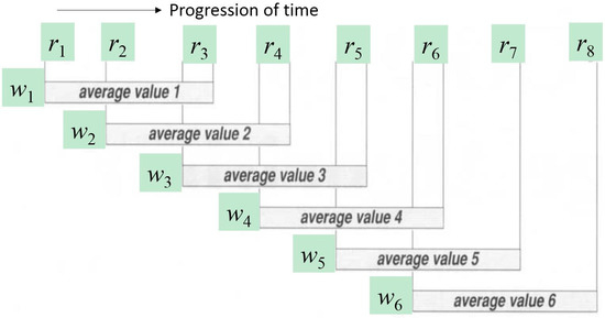To illustrate the operation for the example of the moving average, which is being chosen as the curve-fitting method for generating the shadow feature, a snapshot is shown in Figure 5. In this data pre-processing example, a shadow feature is computed by quickly averaging the past |w| − 1 data values plus its current data value from the current window frame on Y, where w = 3 and the window sizes remain the same in this illustration. The computed shadow values are copied to Yshadow, except for the first |w| − 1 data slots. Symbols “?” are inserted instead marking them as unknown values. The window length, wi, however, may change depending on the latest Hdynamic value, making the shadow feature generation process adaptive to the time series and accommodating the LRMD effect, if any. In reality, of course, large window sizes, e.g., in magnitude of 10, 100, or greater, should be chosen, especially when the data frames are sampled at high frequency by a high-resolution camera.