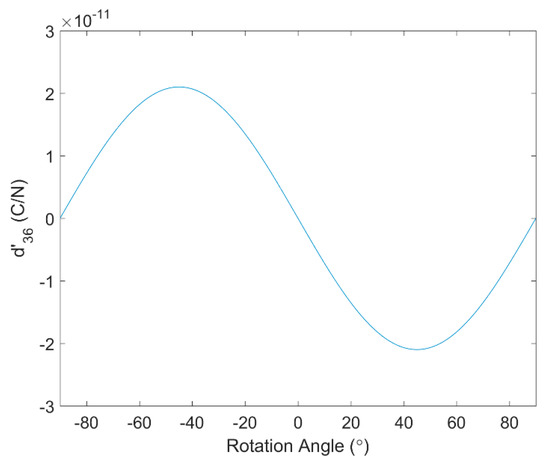 The piezo strain constant is plotted in Figure 2 for rotation angles from −90° to 90°. The maximum coupling between in-plane shear stress, which has indices 12 and is contracted to index 6, and the electric displacement in the 3-direction occurs at ±45°. Since +45° and −45° cases have the same magnitude of , only the +45° case will be considered in the following study. Thus, two PVDF film orientations, 0° and 45°, will be used in the numerical simulation and experiments. The coupling coefficients and for 0° and 45° PVDF film are: