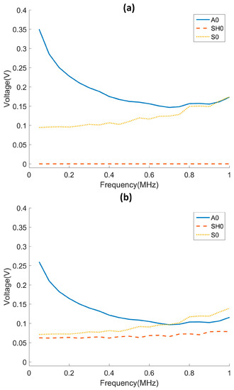 Received voltages with (a) 0° and (b) 45° PVDF film for Lamb wave modes A0 and S0 and SH mode SH0 for frequencies up to 1 MHz.
