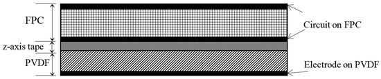 The Lamb-SH wave sensor has a similar design and assembly to the multi-element Lamb wave sensor used in [23], the only difference being that the PVDF film is oriented at 45° instead of 0°. The three-layer patch, as shown in Figure 7, has a flexible printed circuit board (FPC) on the top, z-axis anisotropic conductive tape in the middle and the PVDF film at the bottom. The PVDF film has a one-piece ground electrode at its bottom surface. Each sensor has 16 independent channels formed by the FPC. The center-to-center spacing of the receiving elements is 2 mm. The width of the element is 1.2 mm, which is narrow enough to produce uniform voltage response versus wavelength, but also wide enough to provide good electrical connection to the FPC through the conductive tape. The PVDF film is 110 µm thick and the total footprint of the PVDF sensor is 50 mm × 50 mm. The overall sensor thickness of 300 µm allows it to be very flexible. There are thinner PVDF films available that will provide better flexibility. However, since the PVDF film is very thin and will deform with the plate surface, the same amount of strain will be induced to the PVDF film regardless of how thick it is. Thus, the electric field is independent of film thickness, but thick films will have higher measured voltages. The 110 µm thick film is selected as a compromise between signal-to-noise ratio and flexibility.