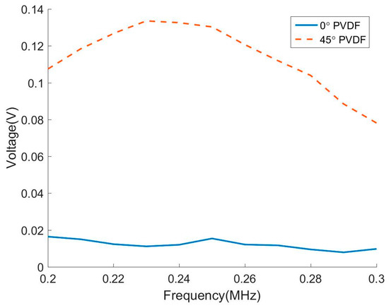 The experimental results for the peak amplitude are shown in Figure 11 from 0° and 45° oriented PVDF films for SH0 mode incidence. The sensitivity of 0° PVDF film to the SH0 mode is practically zero and is much weaker than the 45° PVDF film. This confirms the predictions and the capability of 45° PVDF film to receive SH waves.