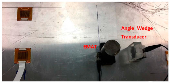The second experimental setup is similar to the first one except that the transmitter is an electro-magnetic acoustic transducer (EMAT) to excite SH waves, as shown in Figure 10. The EMAT has a fixed excitation wavelength and only the SH0 mode around 250 kHz can be excited effectively. Thus, the excitation frequency is swept only from 0.2 to 0.3 MHz. Similarly, the excitation voltage is 100 V and a 5-cycle toneburst is used as the excitation signal.