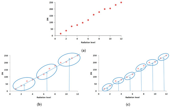 The schematic of grouping and its effect on fitting results. (a) scatter plot of pixel data; (b) data was divided into three groups; (c) data was divided into 6 groups. The horizontal axis and vertical axis are the radiation level and digital number (DN), respectively. The ellipses, arrows and oblique lines in (b,c) are grouping area, average results of each group and fitting results, respectively.