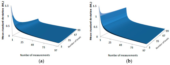 The relationship between the precision and the two parameters, the number of the radiance level and the number of measurements. The horizontal axes are the number of measurements and the number of radiance level, respectively, and the vertical axis is the precision (mean standard deviation) of the calibration result. (a) relationship surface with four evenly-divided groups; (b) relationship surface without grouping.