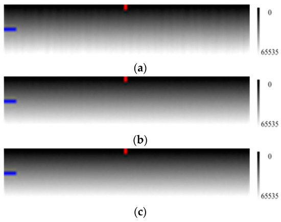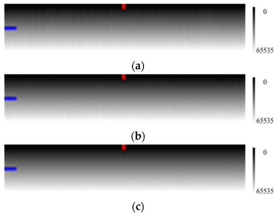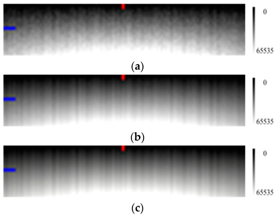 The relative calibration results of the verification image with gain and offset coefficients from a different number of radiance level, where the horizontal direction is the pixels and the vertical direction is radiance level. (a) the result with the coefficient from Figure 9a (3 radiance level data); (b) the result with coefficient from Figure 9b (20 radiance level data); and (c) the result with coefficient from Figure 9c (100 radiance level data). Column 50 and line 10 are marked with red and blue labels, respectively.
