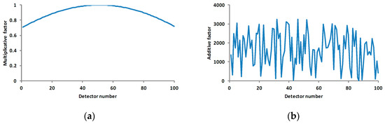 The simulation data was quantified using two bytes with the valid value from 0–65,535. The maximum value of the stochastic noise was less than 5% of the maximum quantified value (3276). The multiplicative factor (synthetical radiation response coefficient) of each pixel was the sinusoidal values from 0.25 π to 0.75 π with 0.005 π being the interval. The additive factor (synthesis of dark current and stochastic noise) is random data with its maximum value less than 5% of the maximum quantified value. The gain coefficient is the reciprocal of the multiplicative factor and the offset coefficient is the quotient of the additive factor divided by the multiplicative factor. The radiation level was evenly distributed using the same interval in the range of 10%–90% of the maximum quantified value. Pixel 51 was selected as the reference standard.