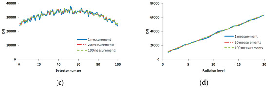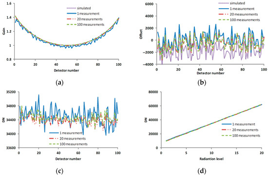 The measurement data profile with the multiplicative factor, the additive factor and various numbers of measurements. (a) the curve of multiplicative factors of pixels; (b) the curve of additive factors of pixels; (c) the profile of line 10 in Figure 3; and (d) the profile of column 50 in Figure 3. The horizontal axes of (a–c) are the pixel number, and the vertical axes of (a–c) are the multiplicative factor, additive factor and DN, respectively. The horizontal axis and vertical axis of (d) are the radiation level and DN, respectively.