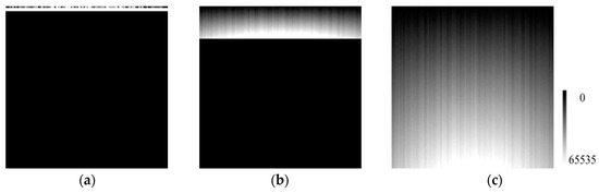 Simulated calibration data with different numbers of radiance level with the horizontal direction for the pixels and the vertical direction for the radiance level. The below black portions in (a,b) are filled with 0. (a) 3 radiance level; (b) 20 radiance level; and (c) 100 radiance level.