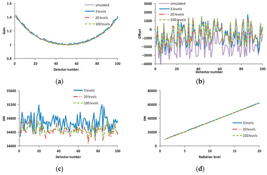 As seen from Figure 12, the calculated gain coefficients became much closer to the simulated gain coefficients and the calculated offset coefficients had little change as the number of levels increased, so the corresponding corrected result was improved.