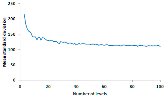 Mean value curve of the standard deviation of the corrected results for each line for various numbers of radiance level. The horizontal axis is the number of levels, and the vertical axis is the precision of correction result (mean standard deviation).