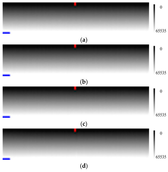 The relative calibration results of the verification image with gain coefficient and offset coefficient calculated from various grouping cases, where the horizontal direction is pixels and vertical direction is radiance level. (a) the result with coefficient from three groups case; (b) the result with coefficient from four groups case; (c) the result with coefficient from 500 groups case; and (d) the result with coefficient from 3000 groups case. Column 50 and line 20 are marked with red and blue labels, respectively.