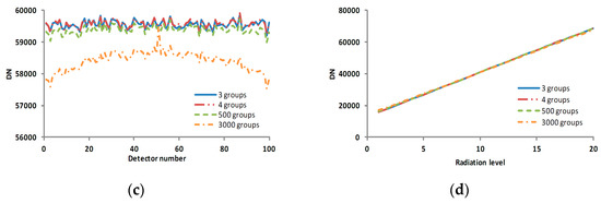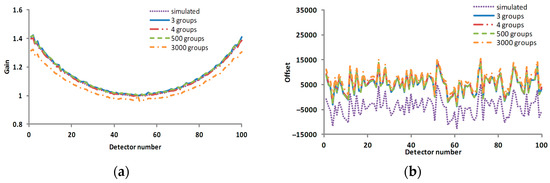 Although the differences among the corrected result images in Figure 15 are not obvious, it is still shown in Figure 16 that the calculated gain coefficients became much closer to the simulated gain coefficients and the calculated offset coefficients had little change as the number of groups decreased, and the corresponding corrected result was improved. The standard deviations of the profiles in Figure 16c for 3, 4, 500, 3000 groups are 122.73, 120.32, 129.53 and 302.57, respectively.
