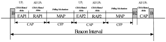 In (a), the hub transmits a beacon on the medium at the beginning of each superframe to arrange time-referenced allocations. Figure 5 shows the superframe structure with the beacon period, which consists of various Access Phases (APs). A superframe incorporates Exclusive Access Phase 1 (EAP1) and Exclusive Access Phase 2 (EAP2) for highest priority nodes, two Random APs (RAP1 and RAP2) and a Contention Access Phase (CAP) for any kind of traffic, two Management AP (MAP) for scheduled uplink/downlink and scheduled/unscheduled bi-link allocation intervals and an optional B2 frame to announce a non-zero CAP period. Except RAP1, other APs may be assumed to be null. In (b), the hub transmits the superframe structure via Timed-Poll (T-Poll) frames and operates during MAP periods only in any superframe. In (c), the third access mode, a hub may provide Type I/II polled allocations for scheduled, unscheduled and improvised transfers. In the case of scheduled transfers, the nodes use their allocated time slots for data transmission, while in the case of unscheduled and improvised transfers, the nodes wait for a poll or post frame from the hub. Type I and Type II access phases are differentiated by the units of allocations. In Type I, the device requests allocation intervals in terms of time, while in Type II, the device requests allocation intervals in terms of the number of frames.
