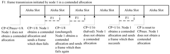The IEEE 802.15.6 standard uses a particular kind of slotted Aloha as a MAC choice. In the slotted ALOHA protocol, the high and low priority traffic to access the channel are predefined by the UP values, as given in Table 1. The nodes seize contention, if , where z is randomly chosen from the interval [0, 1]. To initiate the ALOHA operation of the IEEE 802.15.6 MAC protocol, a CP is picked as: (a) the node shall set CP to for each newly-arrived packet; (b) an even number of failures for the same packet can only halve the CP; (c) if the new CP value is smaller than , the node will keep the CP at . Figure 6 illustrates an example of the slotted ALOHA operation of the IEEE 802.15.6 MAC protocol for a non-emergency node.