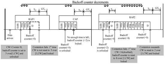 To initiate the CSMA/CA operation of the IEEE 802.15.6 MAC protocol, a contending node having a new packet for transmission shall maintain a CW to detect a new contended allocation, where , and a backoff counter . A CW is picked as: (a) the node shall set CW to for each newly-arrived packet; (b) an even number of failures for the same packet can only double the CW; (c) if the new CW value exceeds , the node will keep the CW at . After choosing the backoff counter value between , the node starts its carrier sensing at the beginning of the next pCSMAslot to determine the current state of the channel. Each pCSMAslot has a fixed duration specified by pCSMASlotLength . The first portion of pCSMAslot corresponds to pCCATime (physical CCA) and is equal to a 63/symbol-rate in time length, while the latter portion of pCSMAslot is used by the contending node to transmit its frame to the transport medium when its backoff counter reaches zero. Each idle pCCATime will lead the contending nodes to countdown the backoff counter by one. Moreover, any transmission on the channel during pCCATime will lead the contending nodes to lock their backoff counters until they have been idle for pSIFS. Other locking/unlocking mechanisms are beyond the scope of this study. When the backoff counter reaches zero, the node then transmits. Figure 7 illustrates an example of the CSMA/CA operation of the IEEE 802.15.6 MAC protocol for a non-emergency node in the RAP period.