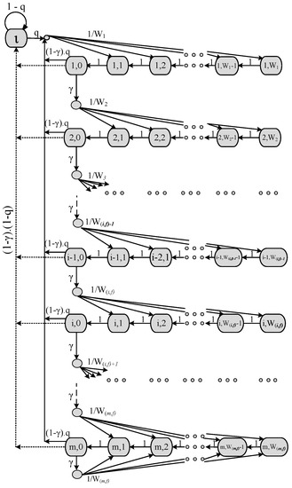 The first Equation in (1) reflects the fact that, after each successful pCCAtime, the backoff counter is decremented. Upon an unsuccessful transmission, the node chooses another random backoff value uniformly distributed in the range 1,2,3,..., and this is shown in the second transition probability of Equation (1). The third case deals with the situation that after a successful transmission, another packet is generated, and the node takes a new backoff for the new packet. The forth case models the fact that after a successful transmission, a node contains no further packet for transmission and so enters the idle state. The node remains in the idle state until a new packet arrives; the node then takes a new random backoff value in the range 1,2,3,... (the first backoff stage); these are depicted in the fifth and sixth expressions. Finally, the last case of Equation (1) views the attribute that the CW size is not increased in a subsequent packet retransmission once the value is achieved.