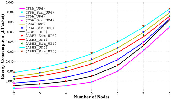 Figure 12 shows the average energy consumption performance for the PEB and ABEB procedures, as a function of the number of nodes in the non-saturated homogeneous scenario. The average energy consumption is given by Equation (19) and calculated on a per-node per-packet basis. We see that the PFB procedure outperforms the ABEB procedure, as the PFB procedure leads to a smooth and gradual increase in the CW size after each collision, which eventually decreases the waiting time, and the contending node can access the channel promptly. Hence, the PFB decreases the expected waiting time and allows the nodes to access the medium promptly, thus improving the average energy consumption performance.
