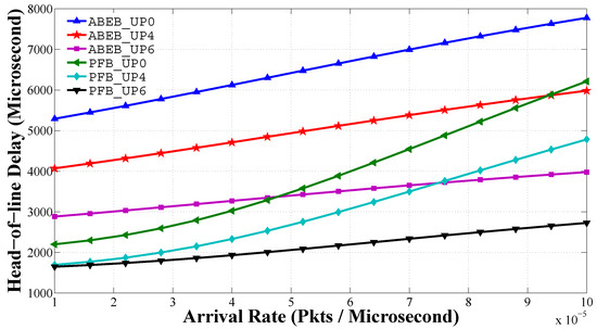 Figure 14 shows the head of line delay performance for PEB and ABEB procedures, as a function of traffic load in non-saturated heterogeneous scenario. The head of line delay performance is given by Equation (28). For a given , we see that the mean frame service time rises with an uplift in the arrival rate. We see that nodes with lower and values can access the medium more often, and hence, the delay is low. The mean frame service time increases quickly for low-priority classes than for high-priority classes as λ increases, because larger values of and introduce more average backoff time. From Figure 14, it is obvious that the proposed PFB procedure shows a reasonable difference in the delay performance over the ABEB procedure of the WBAN MAC protocol. This is due to the fact that after each collision, the PFB leads to a smooth and gradual increase in CW size, while ABEB leads to an irregular and fluctuating CW. Hence, the PFB decreases the expected waiting time and allows the node to access the medium with little delay, thus increasing the mean frame service time performance.