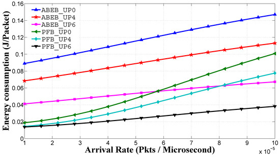 Figure 15 shows the average energy consumption performance for the PEB and ABEB procedures, as a function of traffic load in the non-saturated heterogeneous scenario. The average energy consumption is given by Equation (31) and calculated on a per-node per-packet basis. We see that nodes with lower and values can access the medium with a small backoff value, and hence, the average energy consumption is low. From Figure 15, it is obvious that the proposed PFB procedure shows a reasonable difference in the average energy consumption performance over the ABEB procedure of the WBAN MAC protocol. This is due to the fact that after each collision, the PFB leads to a smooth and gradual increase in CW size, while ABEB leads to an irregular and fluctuating CW. Hence, the PFB decreases the expected waiting time and allows the node to access the medium promptly, thus improving the average energy consumption performance.