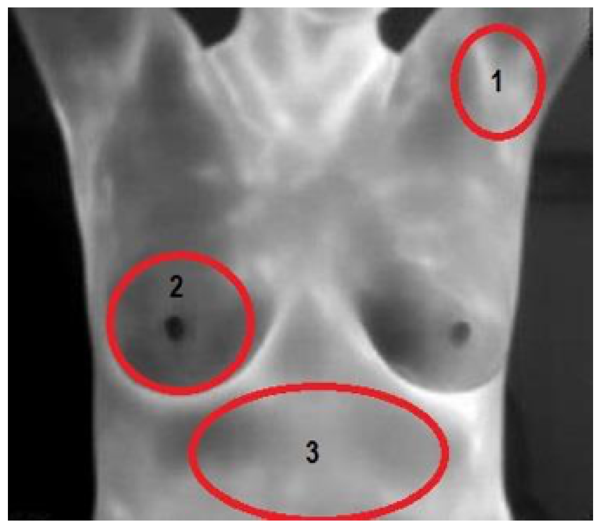 - Kontos, M.; Wilson, R.; Fentiman, I. Digital infrared thermal imaging (DITI) of breast lesions: Sensitivity and specificity of detection of primary breast cancers. Clin. Radiol. 2011, 66, 536–539. [Google Scholar] [CrossRef] [PubMed]