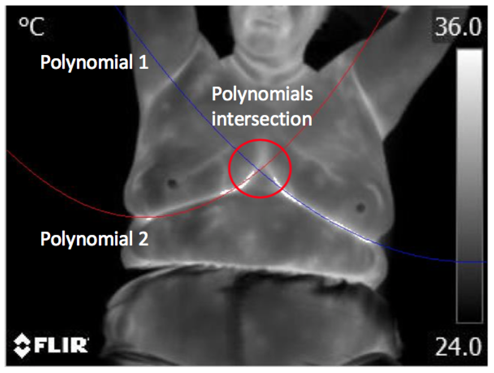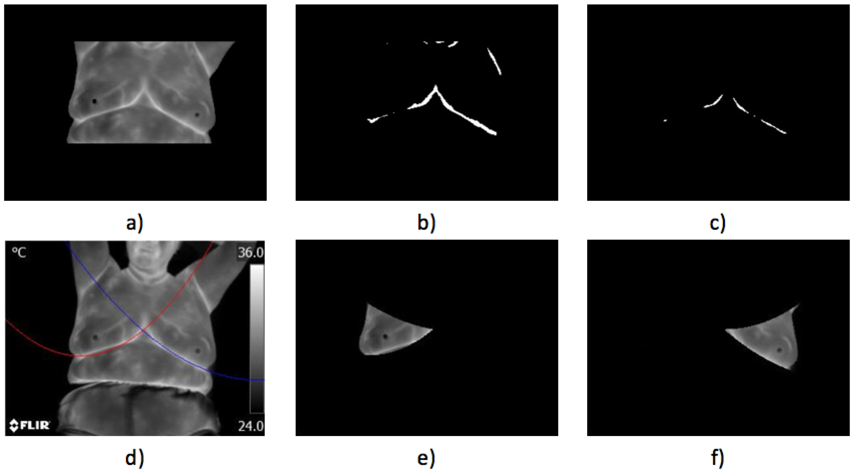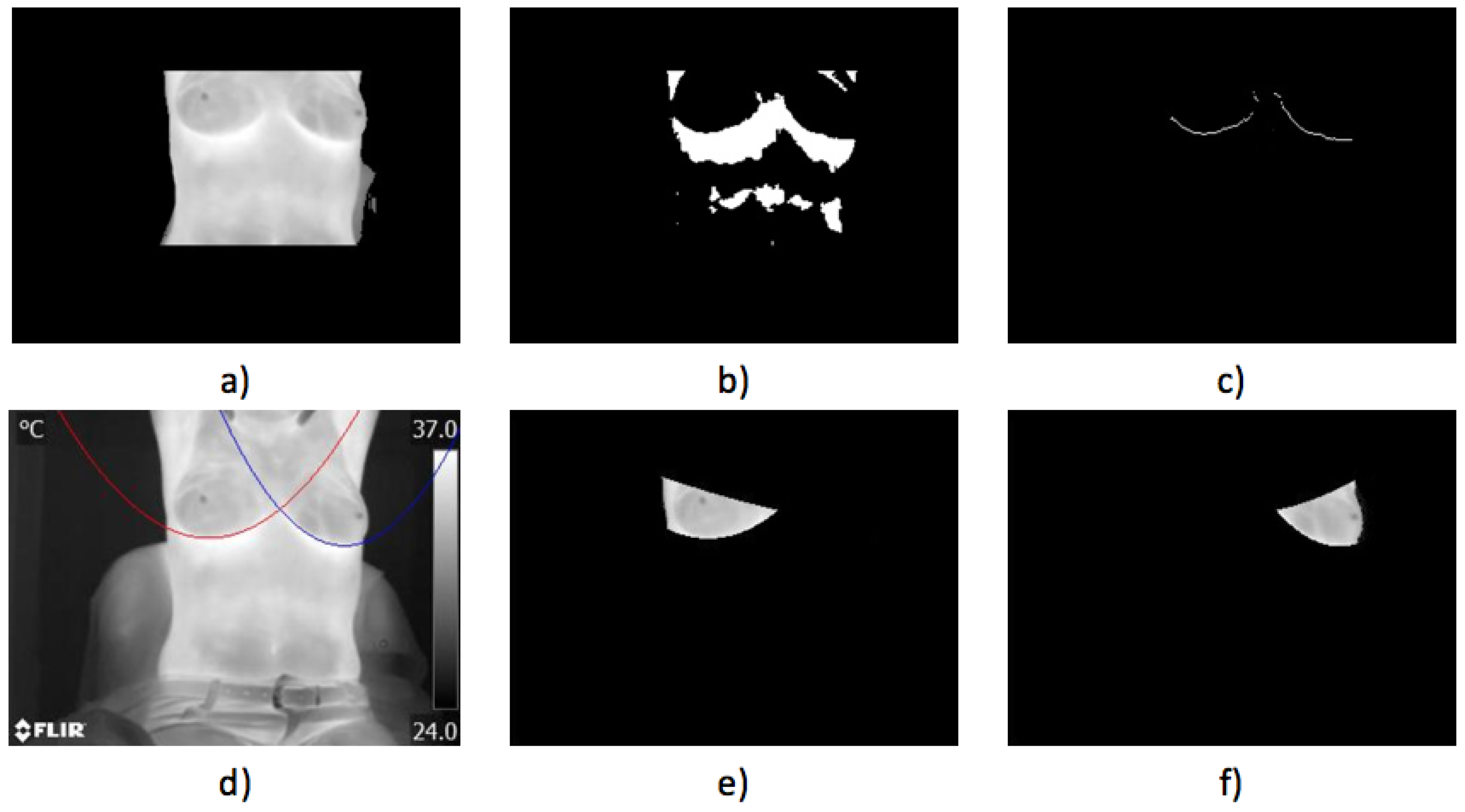 - Case 2, healthy,In Figure 17, the proposed methodology is applied to a woman with a thin constitution. In the acquired thermogram shown in Figure 17a, it is possible to see how a small region corresponding to the seat was segmented together with the patient body by Otsu’s method; however, this does not mean any problem for the finding of inferior limits exhibited in Figure 17a–d. Although at this time, the armpit slope is lighter than the previous case, the proposed segmentation results in being robust enough to separate the right and left breast zones, as can be seen in Figure 17e,f.Finally, the average temperatures present in the right and left breast side are shown in Table 5. Again, the difference of temperatures is less than 1 °C, with a result of no problem detected. This time, the difference between the maximum values is greater than 2 °C and could be associated with the segmentation result shown in Figure 17e, which also includes the side of the breast.