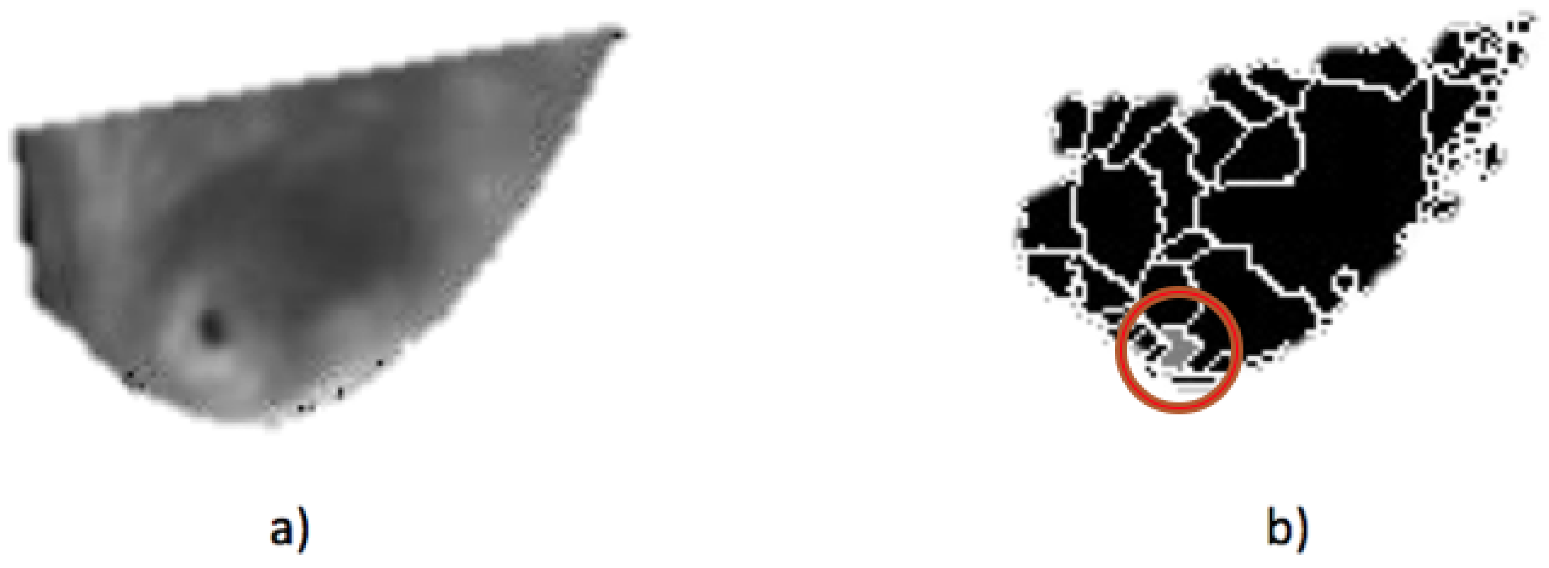 - Case 4, breast cancer:The last case can be seen in Figure 19. The acquired thermogram is shown in Figure 20a. The detection of the breast inferior limits can be seen in Figure 20b–d; meanwhile, the segmented right and left breast are depicted in Figure 20e,f. In the previous two cases, a more uniform temperature distribution was noticeable; in this case, however, multiple regions with high temperatures can be seen in Figure 20a in lighter shades of gray getting close to white. Although a qualitative analysis is not the objective of this paper, such information can be used to infer the existence of a problem that must be analyzed.Posterior to the breast segmentation, the evaluation process delivers the results shown in Table 7. As can be seen, the average temperature difference is 1.92 °C, which is slightly superior to that presented in Case 3. The maximum value and standard deviation present the highest difference of the four cases analyzed, reaching a value of 8.53 °C for the first one and 2.46 °C for the second one.With the numeric result establishing a difference of temperatures between right and left breast higher than 1 °C, the additional step, which implies spotting the location of the hottest region, is performed. Watershed segmentation applied to the right breast, which results in being the one with the highest temperature average, is shown in Figure 21, with the region with the highest temperature denoted in gray and indicated within a red circle; such a region is located in the lower zone of the breast, and the expert is recommended to be aware of it.