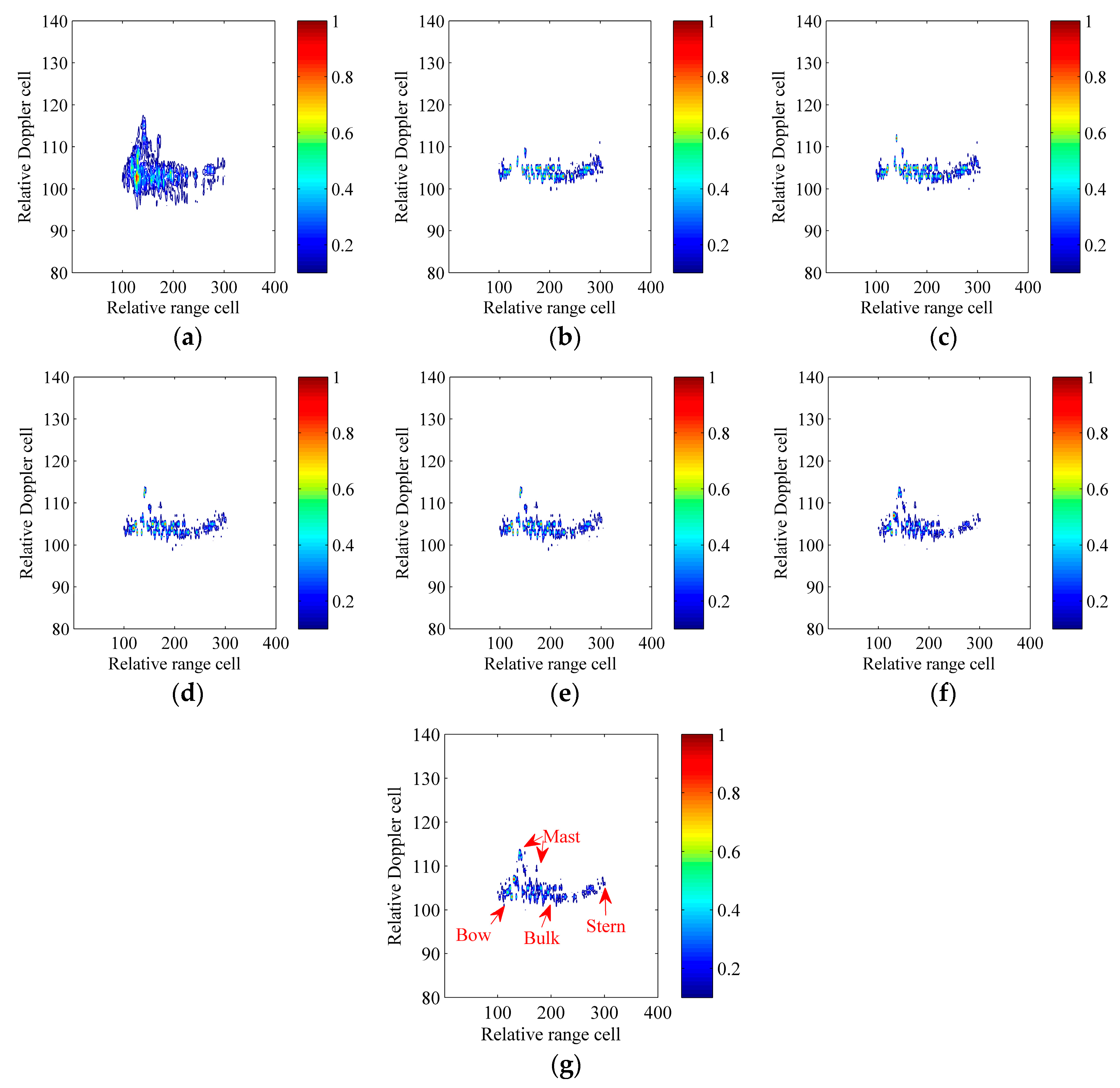 - Bai, X.; Tao, R.; Wang, Z.; Wang, Y. ISAR imaging of a ship target based on parameter estimation of multicomponent quadratic frequency-modulated signals. IEEE Trans. Geosci. Remote Sens. 2014, 52, 1418–1429. [Google Scholar] [CrossRef]