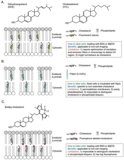 Scheme of visualization of cholesterol in cellular membranes by fluorescent sterols (A) filipin (B) and fluorophore-labelled cholesterol (C) Methodology, benefits and limitations of each cholesterol biosensor are described. Threshold for cholesterol-binding to filipin, 5 mol %, is shown ([]; B).