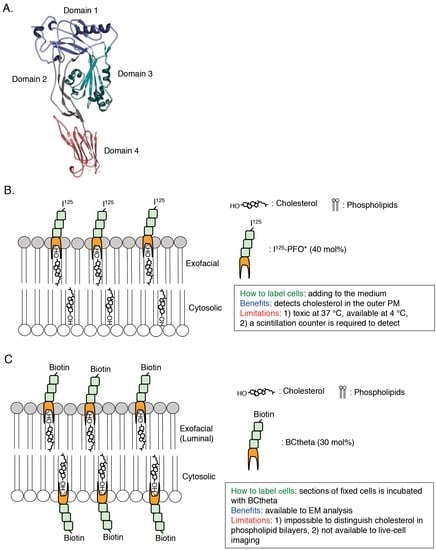 Scheme of detection of cholesterol in cellular membranes by PFO-derived cholesterol biosensors. (A) Domain structure of PFO. The image is reproduced from []. Copyright MDPI 2015. (B,C) Scheme, methodology, benefits, and limitations of I125-PFO* (B) and BCtheta (C) are shown. The number is cholesterol concentration (mol %) threshold required for each cholesterol probe-binding.