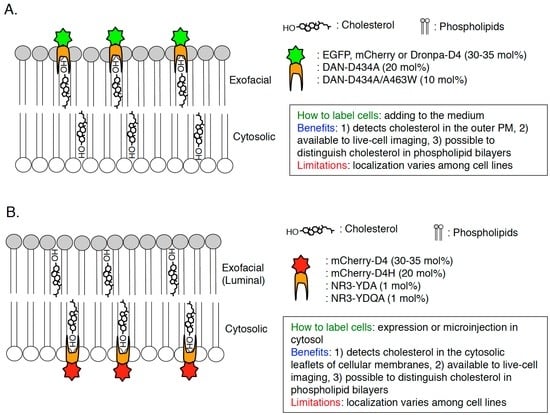 Scheme of visualization of cholesterol in cellular membranes by D4-derived cholesterol biosensors. Scheme, methodology, benefits, and limitations of D4-derived cholesterol biosensors to visualize cholesterol in the exofacial leaflets of the PM (A) and cytosolic leaflets of cellular membranes (B) are shown. The number is cholesterol concentration (mol %) threshold required for each cholesterol probe-binding.